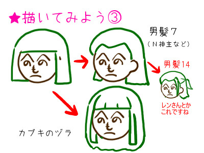 前髪に線4本、もみ上げモドキ追加、髪の長さをやや長めにするとカブキのヅラにw