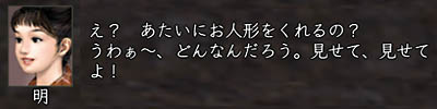 模写済みのヒトガタを持って、神社にいる子供”明”に話しかけます。
